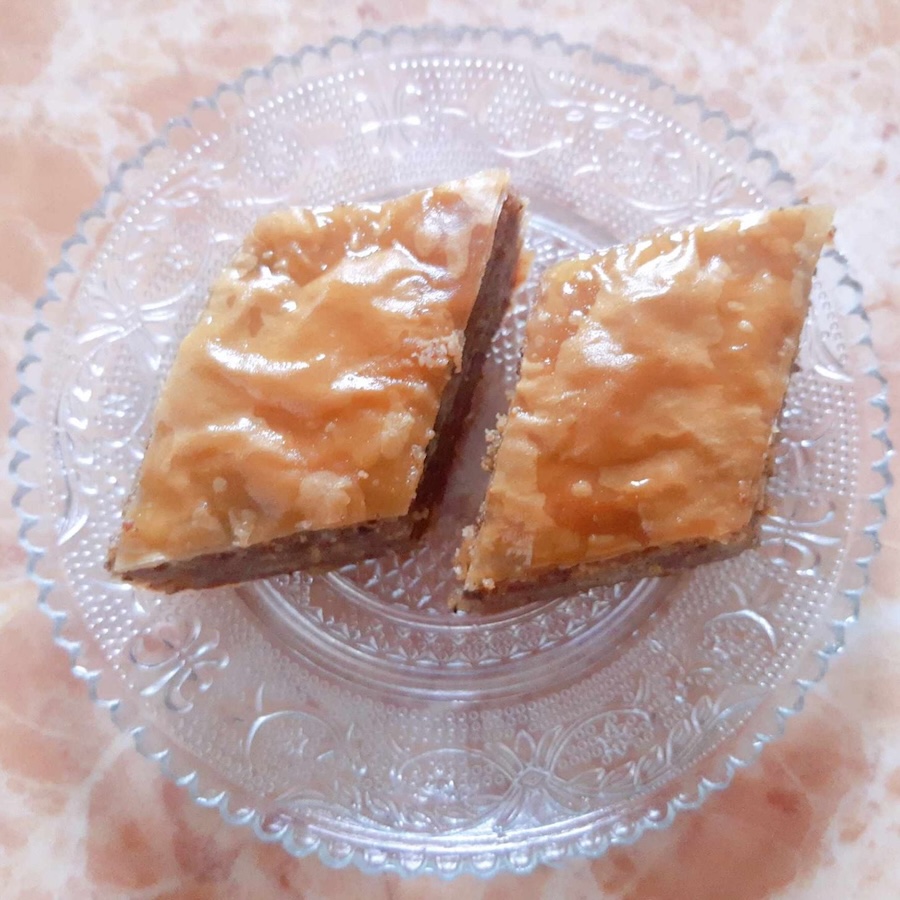 Rastopiti maslac i nasuti ulje. U tepsiju stavljati jufke i mazati svaku pripremljenom masnoćom sa četkicom. Prva 3 reda bez oraha, onda svaku narednu sipati i orasima, i onda zadnje 3 odozgo jufke opet bez oraha. Kada se složi onda izrezati na baklave i preostalom masnoćom preliti cijelu baklavu. Staviti da se peče u dobro zagrijanu rernu, s tim kada se stavi peći smanjiti temperaturu na 100 stepeni i peći 2-3 sata. Na kraju ako ne bude rumena pojačati temperaturu i kada porumeni izvaditi i preliti agdom. Kada prelijemo agdom staviti direktno foliju na baklavu 15 minuta.
